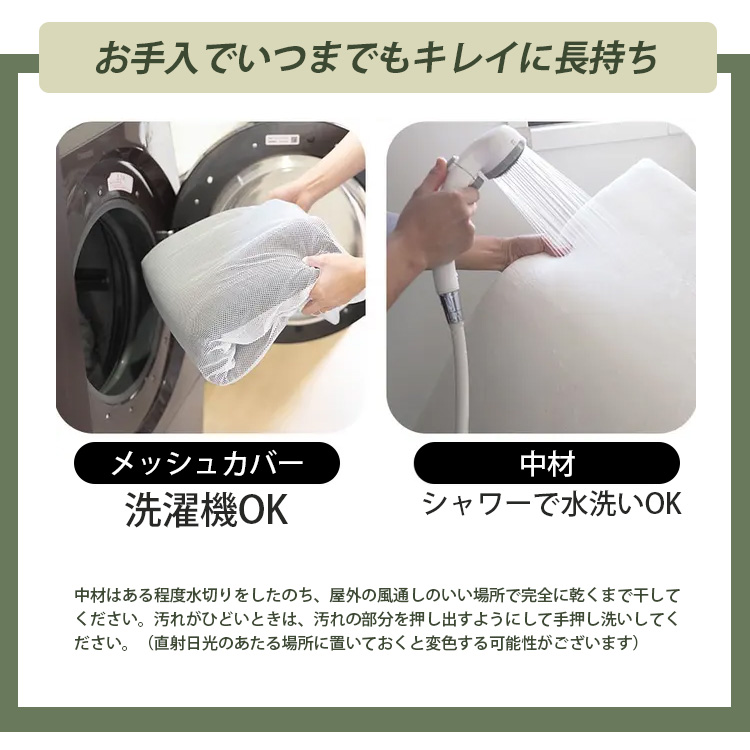 | 外に持ち出して使うものなので洗濯性にもこだわりました。カバーを取り外すことができ、洗濯機で丸洗いできます。 また中材はシャワーをかけて水洗いが可能。ある程度水切りをしたのち、屋外の風通しのいい場所で完全に乾くまで干してください。汚れがひどいときは、汚れの部分を押し出すようにして手押し洗いしてください。 (直射日光のあたる場所に置いておくと変色する可能性がございます) |