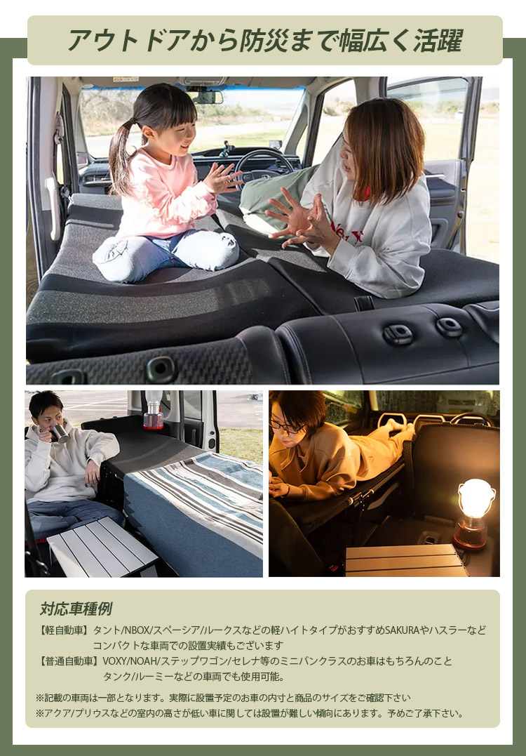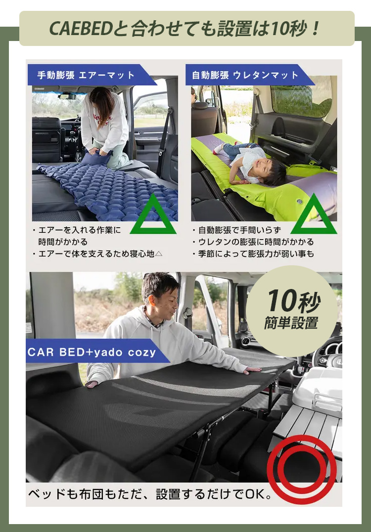 | 別売りのCARBED と共に使うことで車中泊を最大限快適に過ごすことが可能に。 布団裏面に CARBED に固定するためのポケットを設置、 被せて展開することでズレ防止になりストレスなく使うことが可能です CARBEDユーザー様の声で多かった、パイプに体が当たって気になる問題。 yado cozyを同時に使うことで、パイプ部分が覆われ大幅に改善されます またベッドと合わせても設置は10秒!あっという間に設置でき お一人で軽自動車の車中泊からミニバンで、家族での宿泊まで幅広く活躍します アウトドア〜いざという時の避難時に防災グッズとしてもオススメです 【軽自動車】 タント/NBOX/スペーシア/ルークスなどの軽ハイトタイプがおすすめ SAKURAやハスラーなどのコンパクトな車両での設置実績もございます 【普通自動車】 VOXY/NOAH/ステップワゴン/セレナ等のミニバンクラスのお車はもちろんのこと タンク/ルーミーなどの車両でも使用可能。 ※記載の車両は一部となります。実際に設置予定のお車の内寸と商品のサイズをご確認いただきますようよろしくお願いいたします ※アクア/プリウスなどの室内の高さが低い車に関しては設置が難しい傾向にあります。予めご了承くださいませ。 |