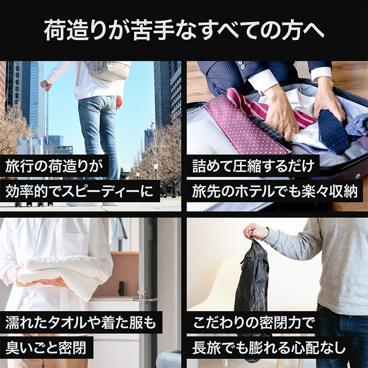 | ● 高い圧縮率・密閉力 徹底的な排気により、圧縮率は約50%!今までの2倍スペースを確保できます。 軍用グレードの密閉力があり、長時間の移動でもずっと圧縮状態を保ちます。 しっかり密閉できるシリコン製のジッパーを採用! 揺れや衝撃で勝手にジッパーが開いてしまうトラブルを防ぎます。 ● 大容量サイズ 製品の容量は30リットル! 成人男性、約3泊分の冬用衣類が入ります。 ● 何度も使える耐久性 高密度ナイロン素材を使用しており、水、傷、汚れに強いです。 旅行時のマイバックとして何度でも使用できます。 ● 防水・防臭性 汚れものや水着、タオルなどニオイや水分が気になる荷物もこのトラベルバッグに詰めれば問題ありません。 万が一、スーツケース内で液体がこぼれても、中身が濡れないので安心です。 出張や旅行、アウトドアにも最高の相棒としてご使用ください。 |