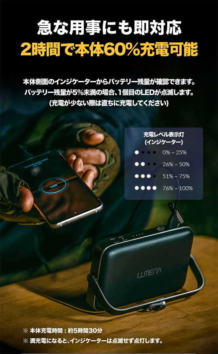 | 仕様 | ■容量:Li-Polymer 3.7V 20,000mAh(74Wh) ■LED色温度:3,000K(Warm)/4,500K(Bright)/6,500K(Cool) ■明るさ:100-3,000Lm ■点灯時間:約10時間〜120時間 ■充電時間:5時間30分(QC Charger,クイックチャージ充電時) ■INPUT(Type-C)5V-3A/9V-2A/12V-1.5A(MAX18W) ■OUTPUT1(Type-C)5V-3A/9V-2.22A/12V-1.67A(MAX20W) ■OUTPUT2(USB-A)5V-3A/9V-2A/12V-1.5A ■防水/防塵等級:IP67 |