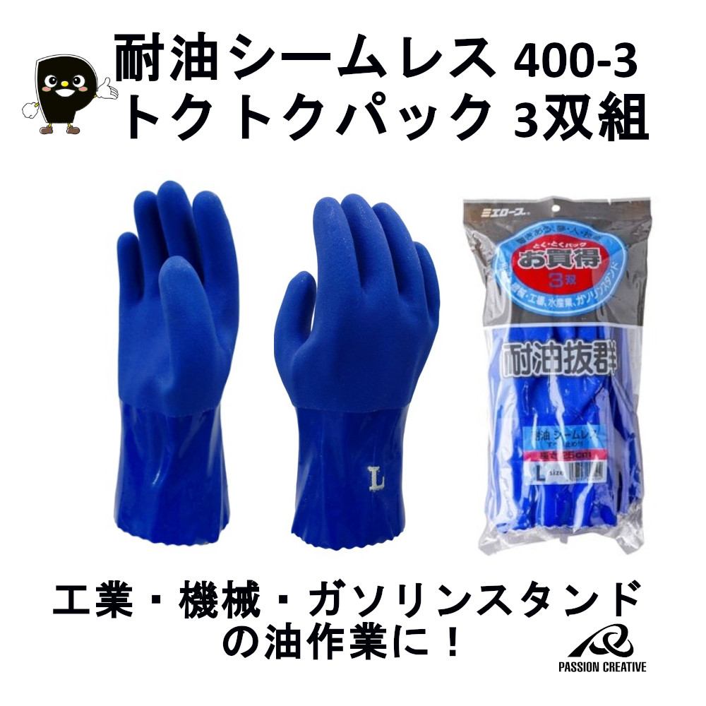 三重化学工業 ミエローブ 耐油シームレス 400-3 トクトクパック 3双組 PVC手袋 綿裏 耐油抜群 抗菌防臭 すべり止め ブルー RoHS10対応