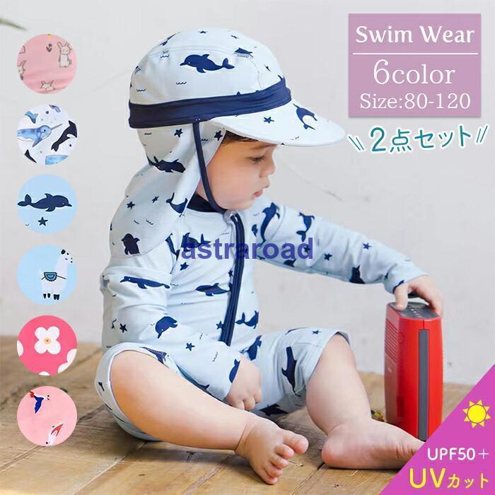 ベビー水着 ロンパース 水着 キッズ ラッシュガード スイムウェア キャップつき 2点セット 女の子 男の子 ベビースイミング かわいい 80 90 100 110 120 130 夏