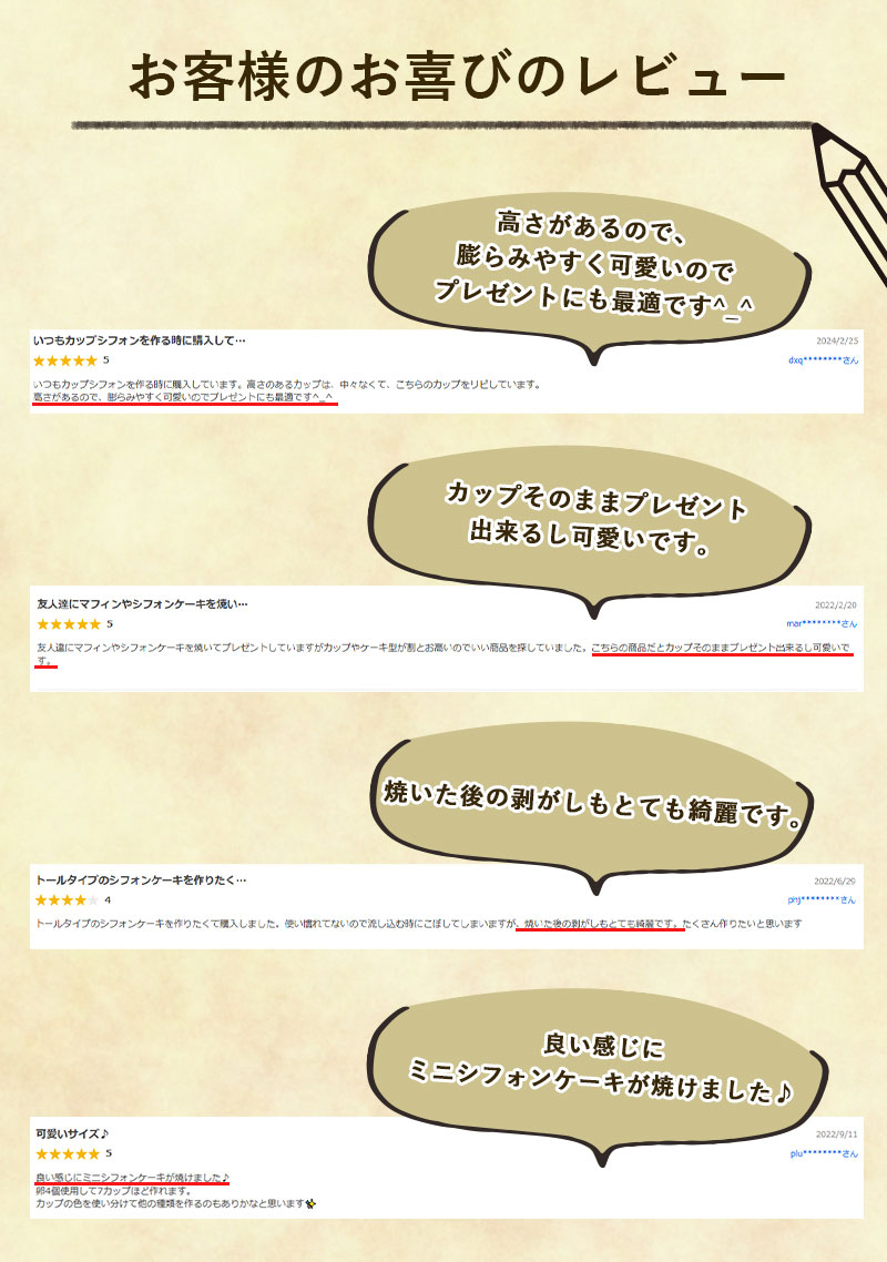 ●こちらの商品に対応している付属商品はこちら 【エージレス対応袋】 詳しくはこちら 【エージレス非対応袋】 詳しくはこちら詳しくはこちら ●生産国:日本 ●焼型不要で生地を入れてそのままオーブンで焼成可能です。 ●食べやすいように、カップにミシン目が入っています。 |