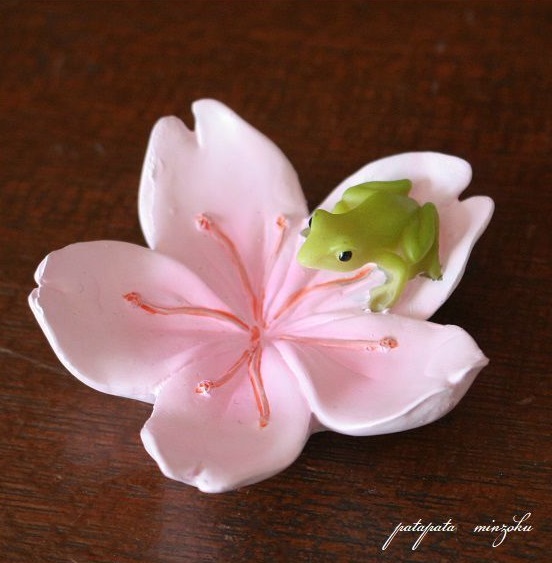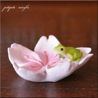 水辺に舞い落ちた桜の花に、ちょこんと小さなカエルの子が座る