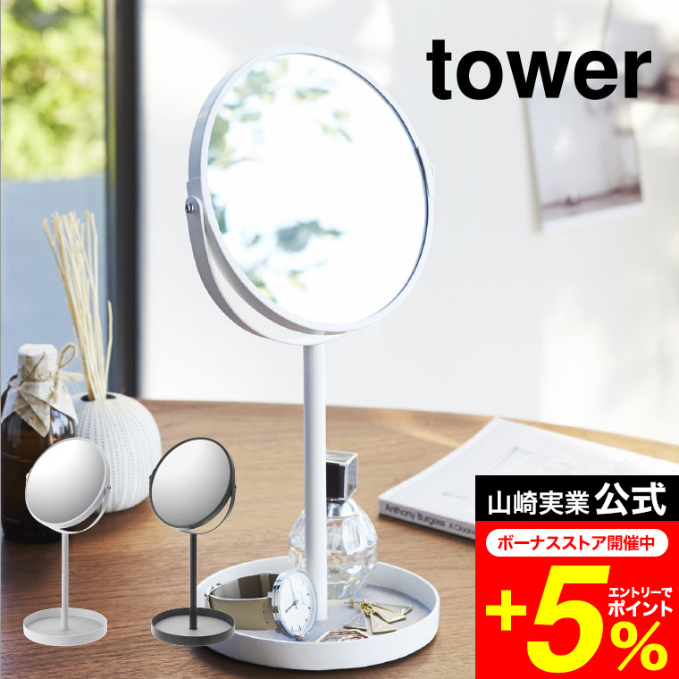 tower 山崎実業 スタンドミラー&トレイ タワー 公式 ホワイト/ブラック 鏡 卓上 アクセサリー収納 丸型 メイク 化粧 トレー 両面 送料無料