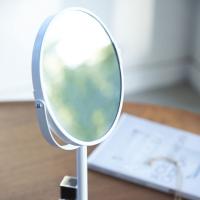ディスプレイ感覚で収納できるトレイ付きスタンドミラー。コスメ小物・指輪・ピアスなどが置けるトレイ付きで、鏡を見ながらアクセサリーをつけられます。ミラー裏面は拡大鏡3倍になっています。台座のトレイに指輪やピアスを収納可能。