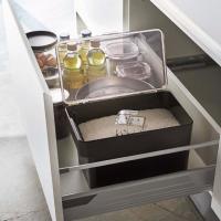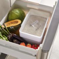 システムキッチンの引き出しに合うスタイリッシュな米びつ。パッキンでしっかり密閉され、お米が最後まできれいにすくえます。蓋をパチッとロックしておけば、お米を湿気と酸化から防いでくれます。炊飯器の横に置いておけば作業もスムーズ。蓋は全面が開くからお米がすくいやすく、残量が分かりやすい透明蓋。底の形が付属の計量カップにピッタリとフィットするから、残りのお米をきれいにすくい取ってくれます。