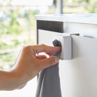 シンク扉に簡単取り付け。タオルや布巾を指で差し込むだけのタオルホルダー。戸棚下にも取り付け可能。