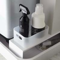 洗濯機の排水口とホースを隠しながら、その上を有効活用できる伸縮ラック。伸縮できるから洗濯機のサイズや防水パンの内寸サイズに合わせてサイズを調整できます。