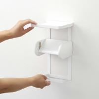 トイレットペーパーホルダーに差し込むだけの簡単取り付け!ホルダーの上下が収納スペースに。下部ハンガーにはトイレットペーパーロールのストックを収納可能。トレーは掃除用具の収納やスマートフォンの一時置きなどに使えます。
