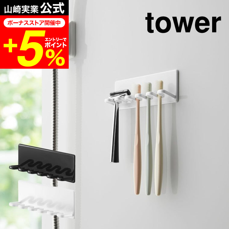 tower 山崎実業 マグネットバスルーム歯ブラシホルダー 5連 タワー お風呂 公式 ホワイト/ブラック 浴室収納 洗面 お風呂場 カミソリ ホルダー