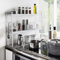 コンロ奥の隙間に置くだけ!油はねや調理汚れをしっかりガードしてくれる2段ラック。 調理道具やスパイスなどがたっぷり収納でき、ビルトインタイプのコンロ周りのラックとしても使えます。 棚板が上に開くので、設置したままガスの元栓の開閉が可能。