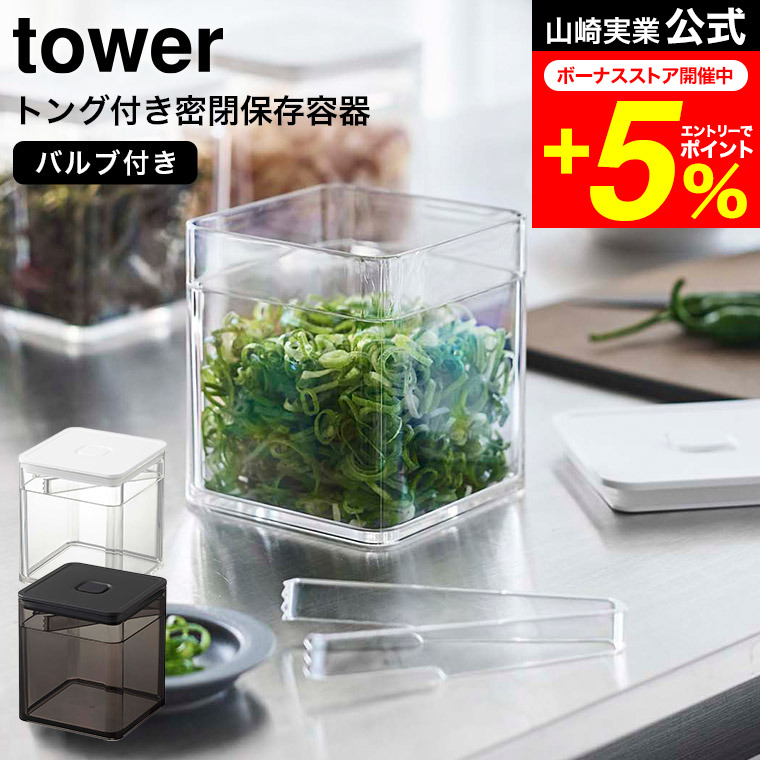 tower 山崎実業 トング付き バルブ付き密閉保存容器 タワー キッチン 公式 ホワイト/ブラック 5467 5468 / 薬味入れ 調味料入れ バルブ 簡単密閉