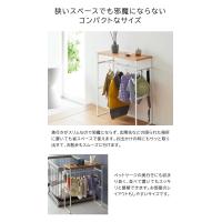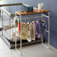 小型犬〜中型犬サイズの洋服や小物をまとめて収納できるペットコートハンガーラック。奥行き約21cmとスリムな形状で、ペットケージの横や玄関近くに置いても邪魔になりません。天板にはおやつのストックなど小物が置けて便利。耐荷重は天板3kg、ハンガー3kgと充分です。