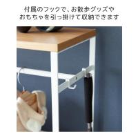 付属のフックにリードやお出掛け小物を引っ掛けておけば、お散歩に行くのもスムーズに。玄関や廊下に置いてコンソールテーブルとして使ったり、ベビーベッドの横に置いてベビー服用のハンガーラックとしても使えます。スチール×天然木のナチュラルな天板で、どんな空間にもなじむデザインです。