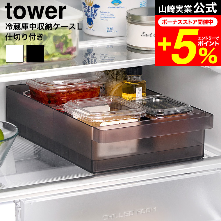tower 山崎実業 冷蔵庫中収納ケース タワー L 仕切り付き キッチン 公式 送料無料 1477 1478 ホワイト ブラック / 冷蔵庫内 収納ケース