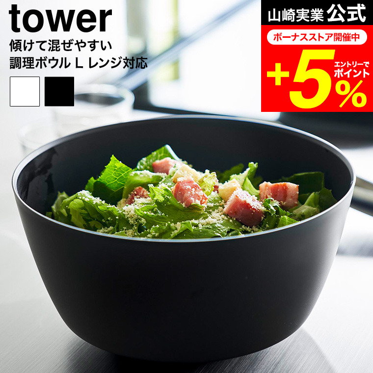 tower 山崎実業 傾けて混ぜやすい調理ボウル タワー L 電子レンジ対応 公式 1389 1390 ホワイト ブラック / 4L キッチンボウル プラスチック