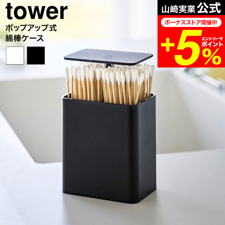 tower 山崎実業 ポップアップ式綿棒ケース タワー 公式 10284 10285 ホワイト ブラック 送料無料 / 綿棒入れ 爪楊枝ケース つまようじケース