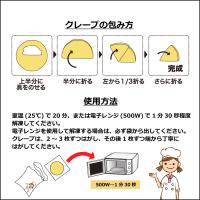 【解凍方法】室温(25℃)で20分または電子レンジ(500W)で1分30秒程度解凍して下さい。電子レンジを使用する場合は必ず袋から出して下さい。クレープは2〜3枚ずつはがし、その後1枚ずつ丁寧にはがして下さい。