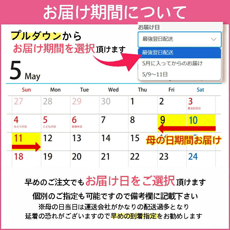 それ以外の期間で母の日カードご希望の場合は備考欄に【母の日カード必要】と記載下さい