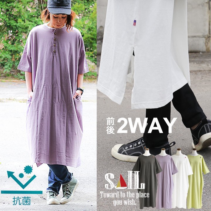 ワンピース ワンピ Tワンピ レディース 5分袖 5分袖 ポケット付き ヘンリーネック 前後2WAY ダブルフロント ツバメ 刺繍 SAIL