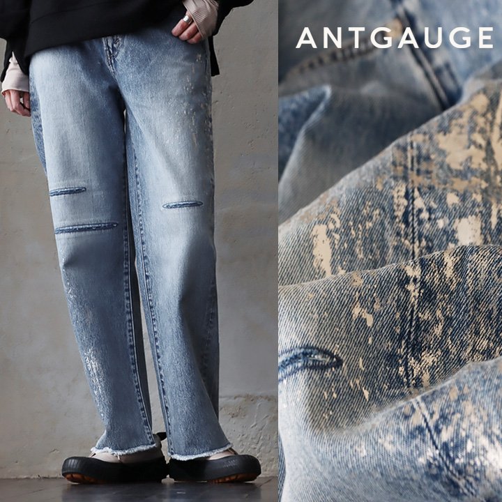 Antgauge アントゲージ パンツ ストレート ワイド デニム レディース ダメージ 綿100 ノンストレッチ すっきり 細見え パティ
