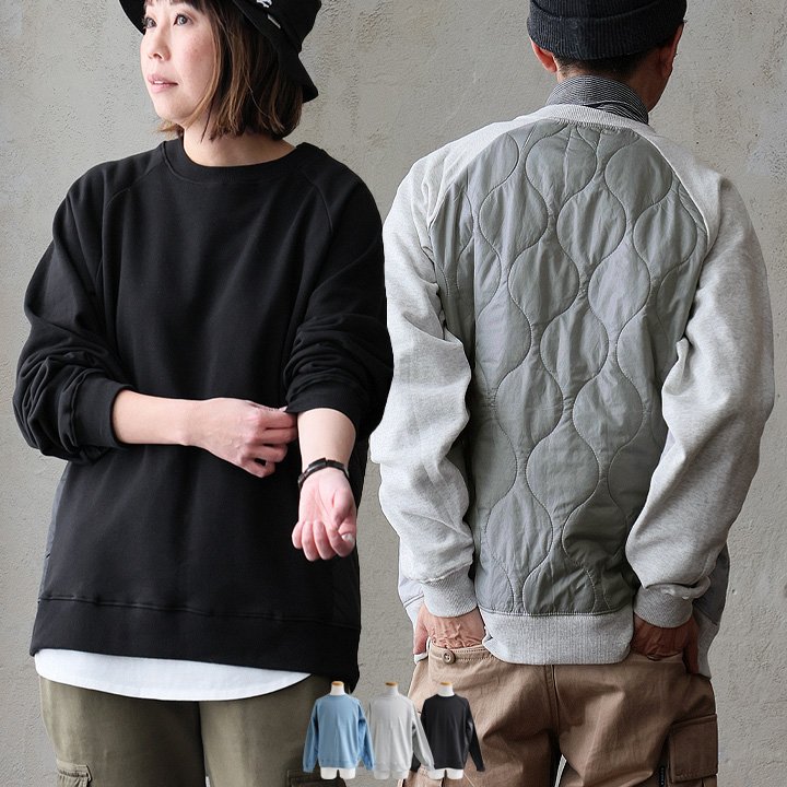 スウェット トレーナー 長袖 メンズ レディース クルーネック 綿100 コットン 裏毛 薄中綿 キルティング 暖かい 軽い すっきり 大きいサイズ カジュアル 秋 冬 パティ