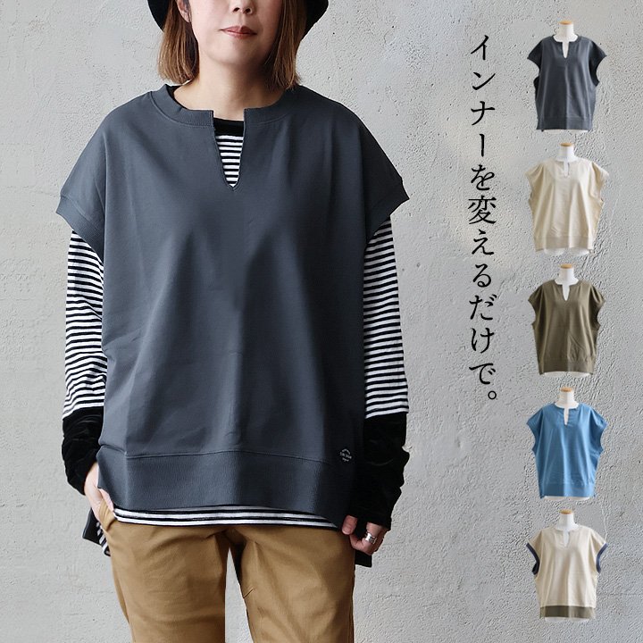 ベスト レディース キーネック スウェット 重ね着 綿100 コットン ミニ裏毛 柔らか 伸縮性 無地 伸縮性 体型カバー パティ CUBE SUGAR キューブシュガー