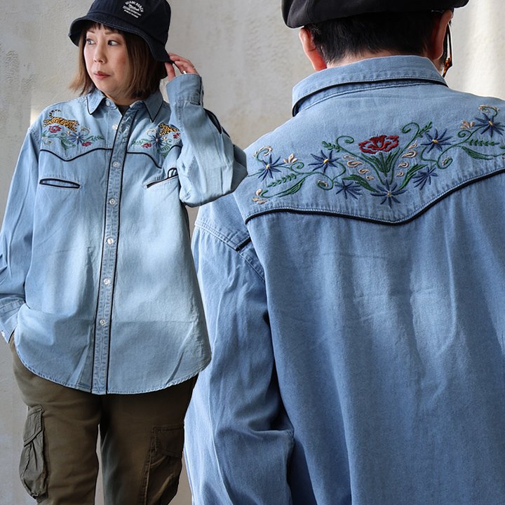 シャツ ウエスタンシャツ デニムシャツ メンズ レディース 綿100 コットン フラワー トラ 刺繍 パティ