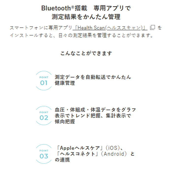 ■付属品:単4形アルカリ乾電池2本(モニター用)、取扱説明書/保証書、医療機器添付文書/EMC技術資料、アプリ・通信説明書、収納ケース