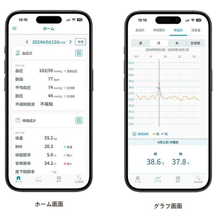 「カプッとカフ」でかんたん装着スマートフォンで測定データの管理ができる