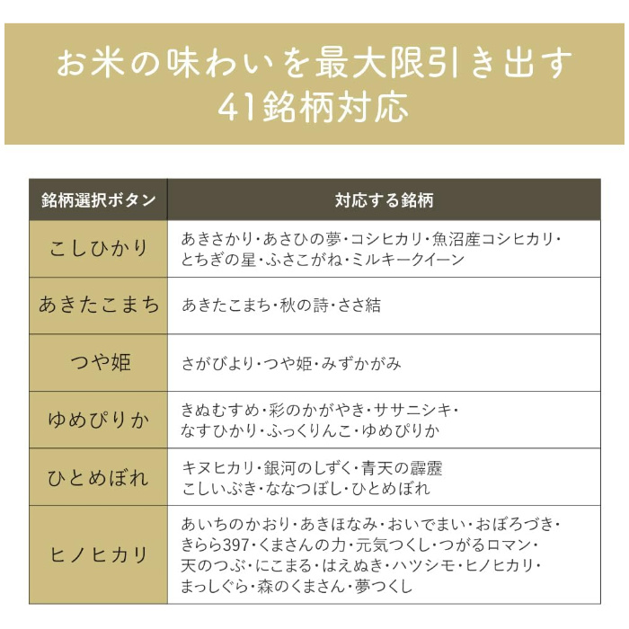 銘柄純白づきはお米の白度を追求しながらも、繊細な亜糊粉層を残す絶妙な精米を実現。41銘柄について何度も何度も検証を重ね、それぞれに最適な精米を行うこれまでにない機能を搭載しました。