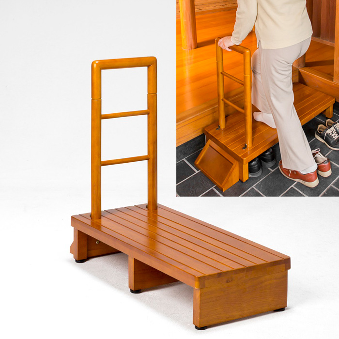 ■玄関の段差を減らして上り下りがラクになる手すり付き玄関台。1段追加されるので高い玄関の上り下りがラクになります。また、手すりも付いているので安心。台の横には横倒れ防止の支えが付いています。