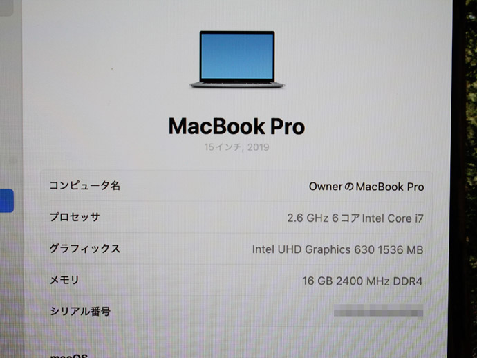 | 機種名 | Macbook Pro 15-inch,2019 MV902J/A |