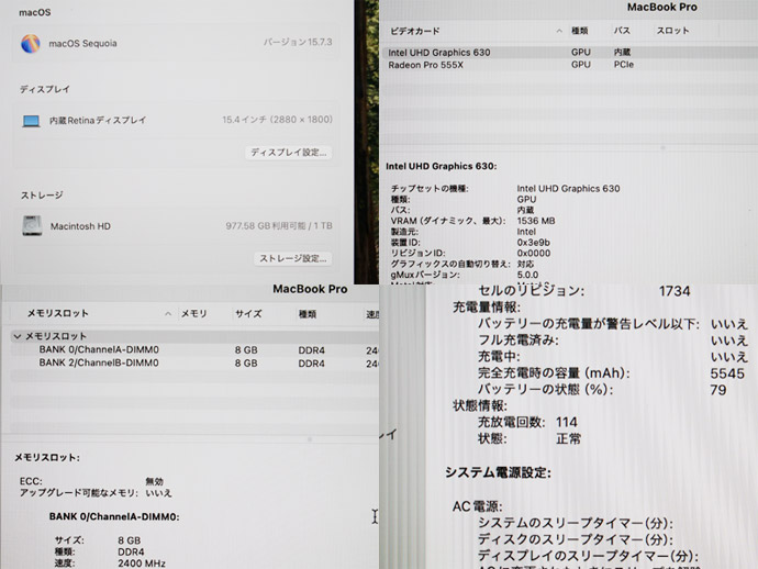 | グラフィックス | Intel UHD Graphics 630 + Radeon Pro 555X 4GB |