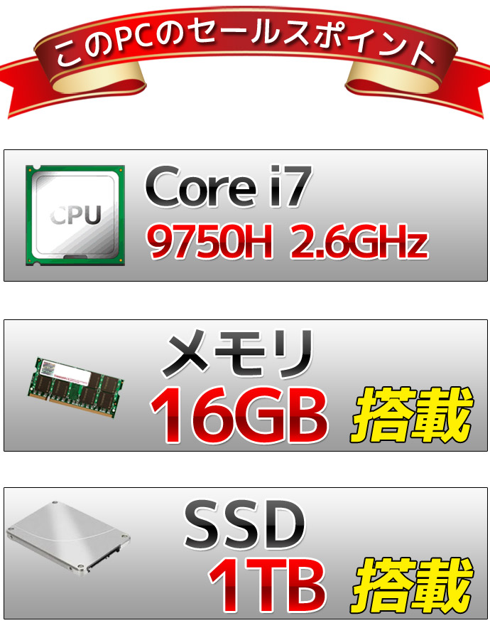 | CPU | Core i7 9750H 2.6Hz ※ターボブースト時最大4.5GHz |