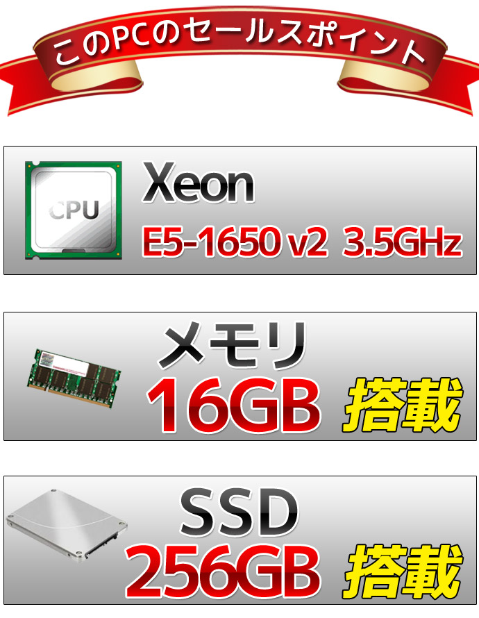 | CPU | Xeon E5-1650 v2 3.5GHz(6コア/12スレッド) ※ターボブースト時最大3.9GHz |