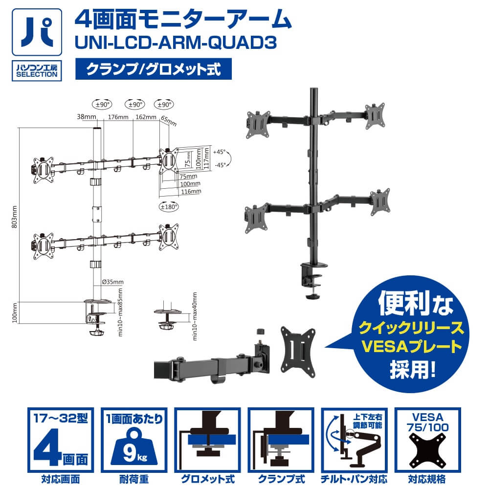 UNI-LCD-ARM-QUAD3 (パソコン工房限定モデル)| VESA規格 | 100×100、75×75 |