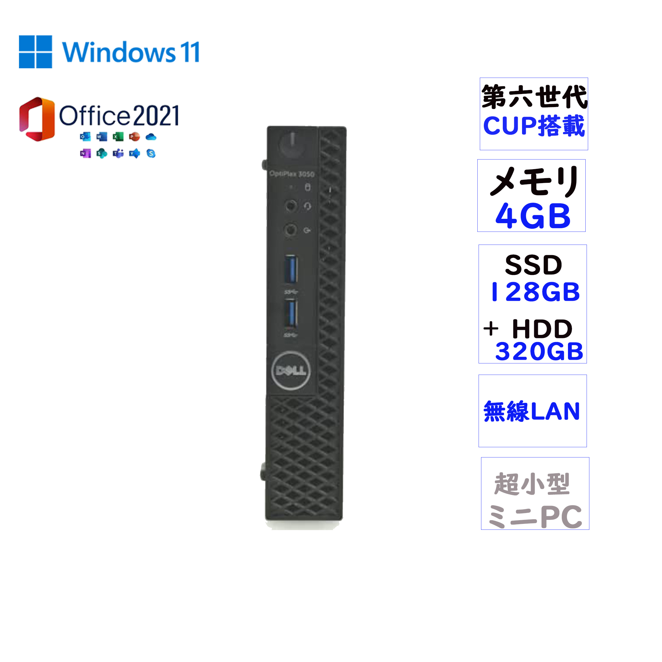 デスクトップパソコン minPC 中古 パソコン 第六世代CPU メモリ4GB SSD128GB+HDD320GB Window11 MSoffice2021 Dell OptiPlex 3050 Micro 無線 USB3.0 安い