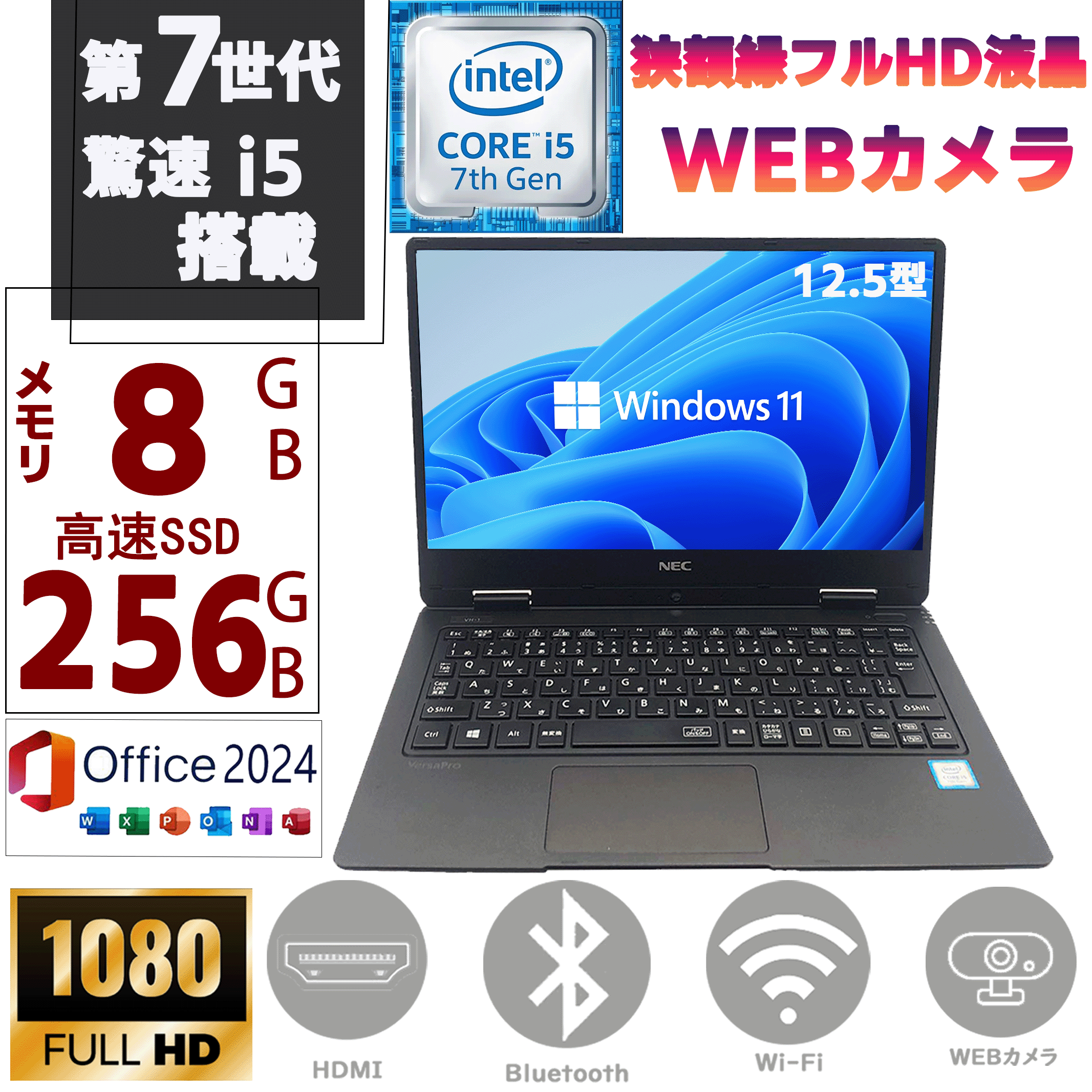 爆買 ノートパソコン メモリ8GB SSD256GB Window11 MSoffice2024 12.5型フルHD 第7世代Corei5 NEC Versapro VH-1 / VH-3 HDMI カメラ 無線