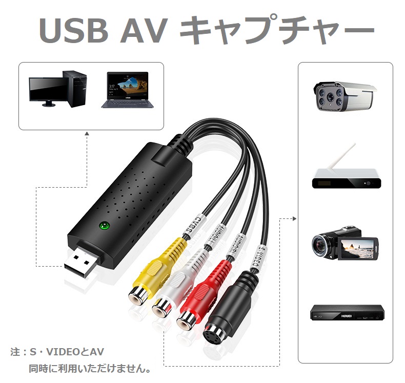 | 適用機種 | S・VIDEO/ AV RCA出力からUSB2.0入力可能な機種 接続方法は画像付でご案内しております。ご確認の上、ご利用くださいませ。 ※使用方法についてのサポートは行っていない為、ご注意ください。 ※入荷時期により予告なく仕様やデザインが変更することがございます。予めご了承のほどお願いします。 |