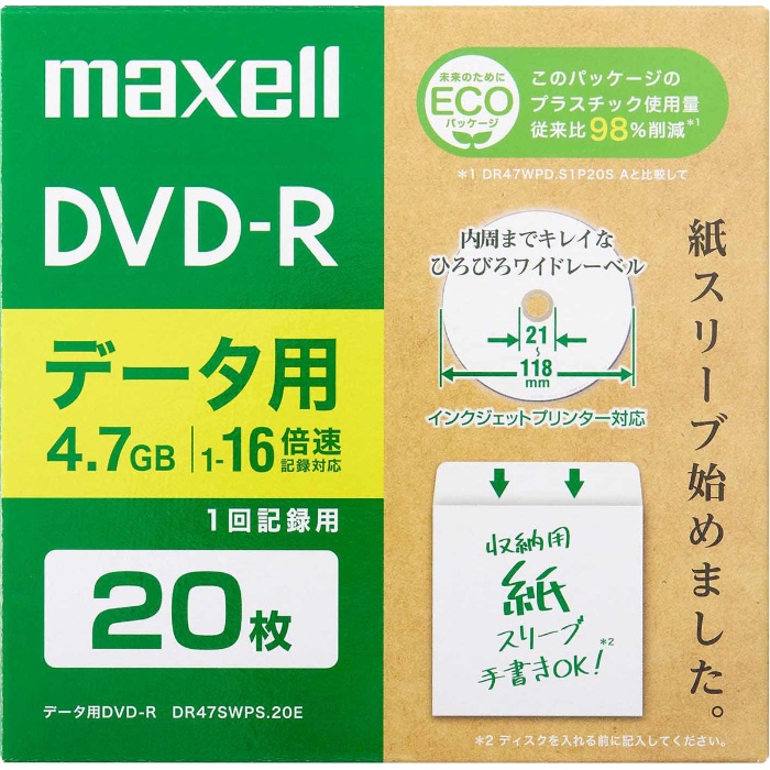環境に配慮した紙スリーブを採用。収納時の省スペース化にも。内周までキレイな印刷ができる「ひろびろワイドレーベル」。高性能記録膜と高精度基板を採用し、16倍速記録でも安定した記録特性と優れた保存性を実現。