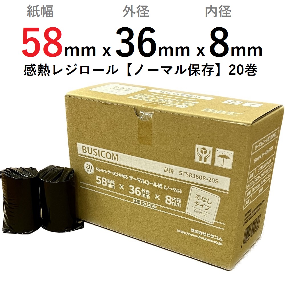 ビジコム 感熱ロール紙 感熱レジロール紙 感熱紙 58mm×36mm×8(芯なし) キャッシュレス決済端末向け ノーマル サーマルロール 20巻 ST583608-20S