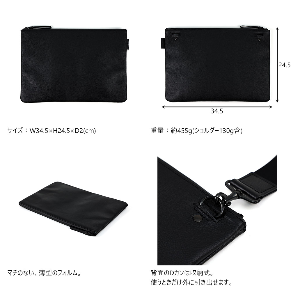 スーツスタイルにも、カジュアルな装いにも相性の良い、A4サイズ対応のクラッチバッグです。革の魅力を生かしたシンプルなデザインで、ワンランク上のお洒落を愉しむことができます。本体は、A4サイズのノートやクリアファイルを収納することができるサイズ。内側にはスマホサイズのポケットが3つと、10インチまでのタブレット(iPad Air等)が収納可能な、クッション材入りのポケットが1つ付いています。付属のショルダーベルトを取り付ければショルダーバッグにもなり、両手を空けたいときに便利です。Dカンは収納式なので、使わないときは内側に入れ込むことができます。ペーパーレス化が進み、ほとんどの仕事をPCやタブレットでこなす、現代のノマドワーカーをイメージした、シンプルなクラッチバッグです。