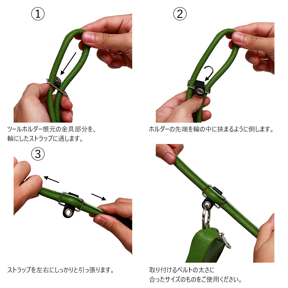 ベルトの好きな位置に装着し、革小物をぶらさげられるツールホルダーです。 梱包用のバンドストッパーから発想した便利アイテムになります。 ショルダーベルトの自由な位置にセットし、先端のハトメに革小物などを吊るすことができるようになります。 ハンギングベルトのように、ライフスタイルに合わせてチョイスした革小物・ポーチなどを下げれば身軽な外出が可能です。。 意匠登録出願中の便利アイテムになります。 【ツールホルダー装着方法】1ベルトや紐を輪にして角カンに通します。2輪の間に革パーツをはさみます。3ベルトや紐を左右に引っ張ればロック完了です。