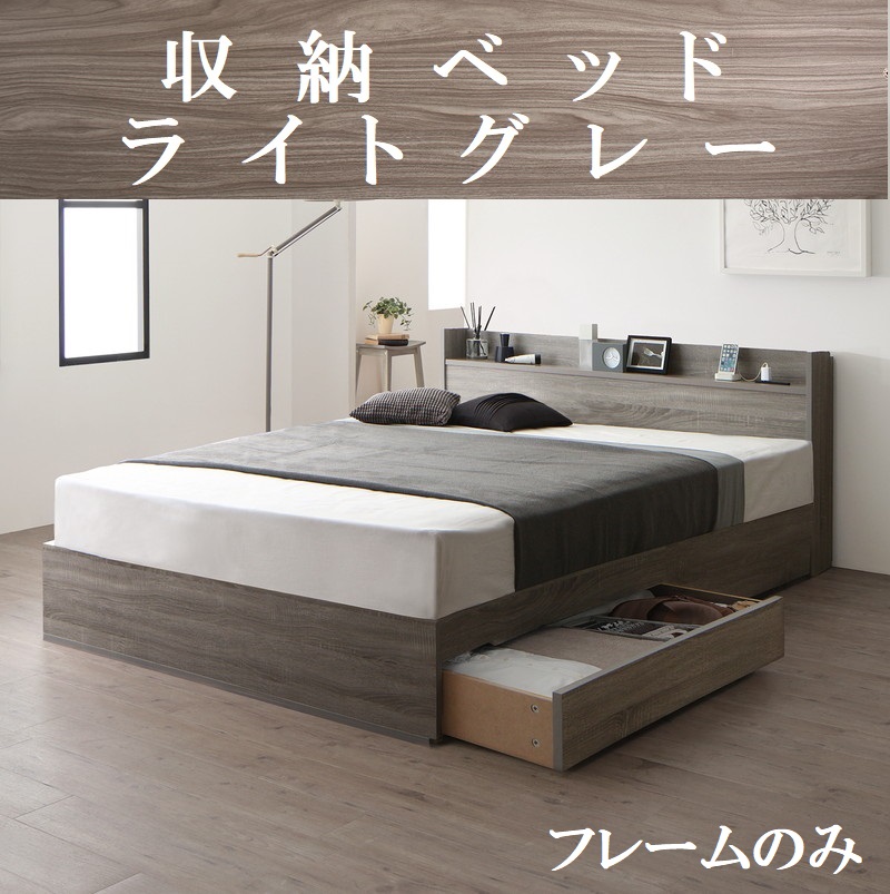 シングルベッド フレームのみ 引出し収納・棚・コンセント2個付 収納ベッド ライトグレー シャビーグレー ベッド シングル