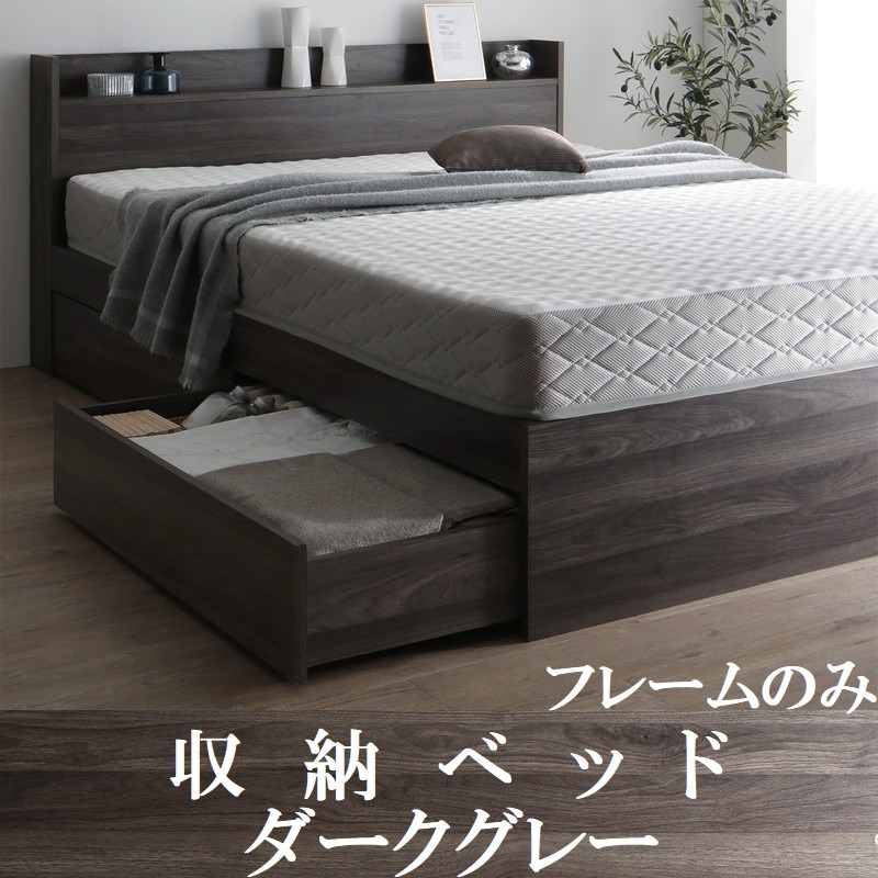 シングルベッド フレームのみ 引出し収納・棚・コンセント2個付 収納ベッド ダークグレー ベッド シングル