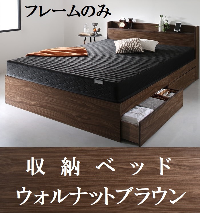 シングルベッド フレームのみ 引出し収納・棚・コンセント2個付 収納ベッド ウォルナットブラウン ベッド シングル