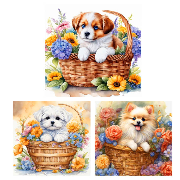 フラワーバスケットに入ったかわいい子犬のデザインです。