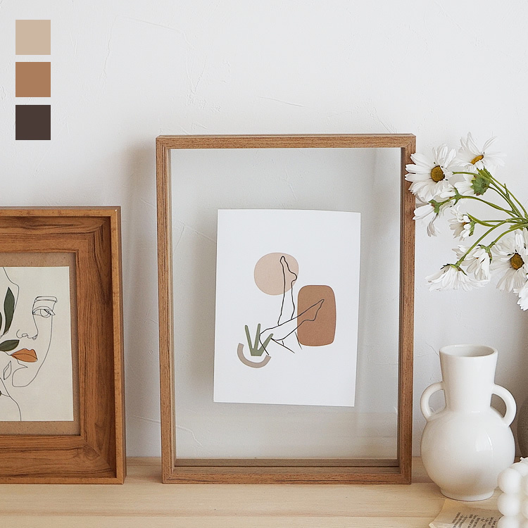 木製のフレームに透明のガラス板で挟むA4サイズのフォトフレームです。ガラスとガラスの間に写真やポストカードやファブリックなどを挟んで飾ることができます。北欧や韓国インテリアにピッタリです。